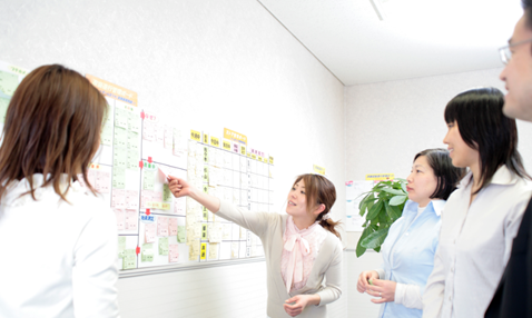 ミーティングは、改善ボードの前に集まって、改善ボードを使って行います。
