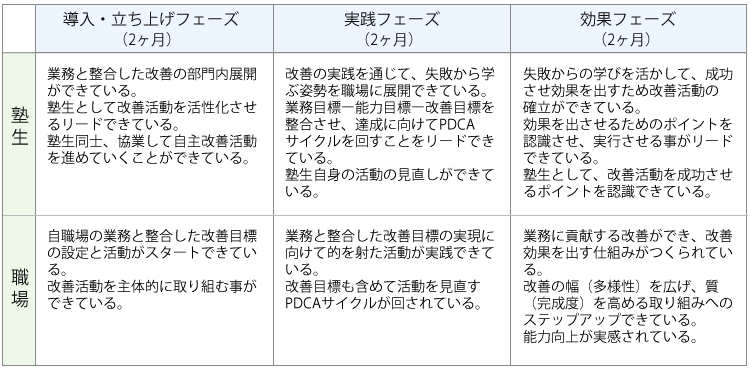 改善塾は、3つのフェーズに分けて活動を進めていきます。それぞれのフェーズは育成対象と改